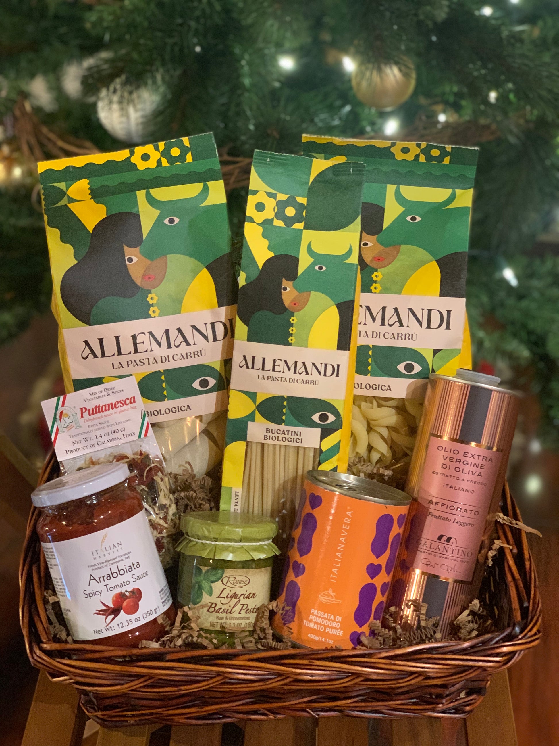 3 packages Italian made pasta, tomato sauce, Italian tomatoes, Spice Packet, Ligurian Basil Pesto, Italian Extra-Virgin Olive Oil wrapped in a gift box. $125.00