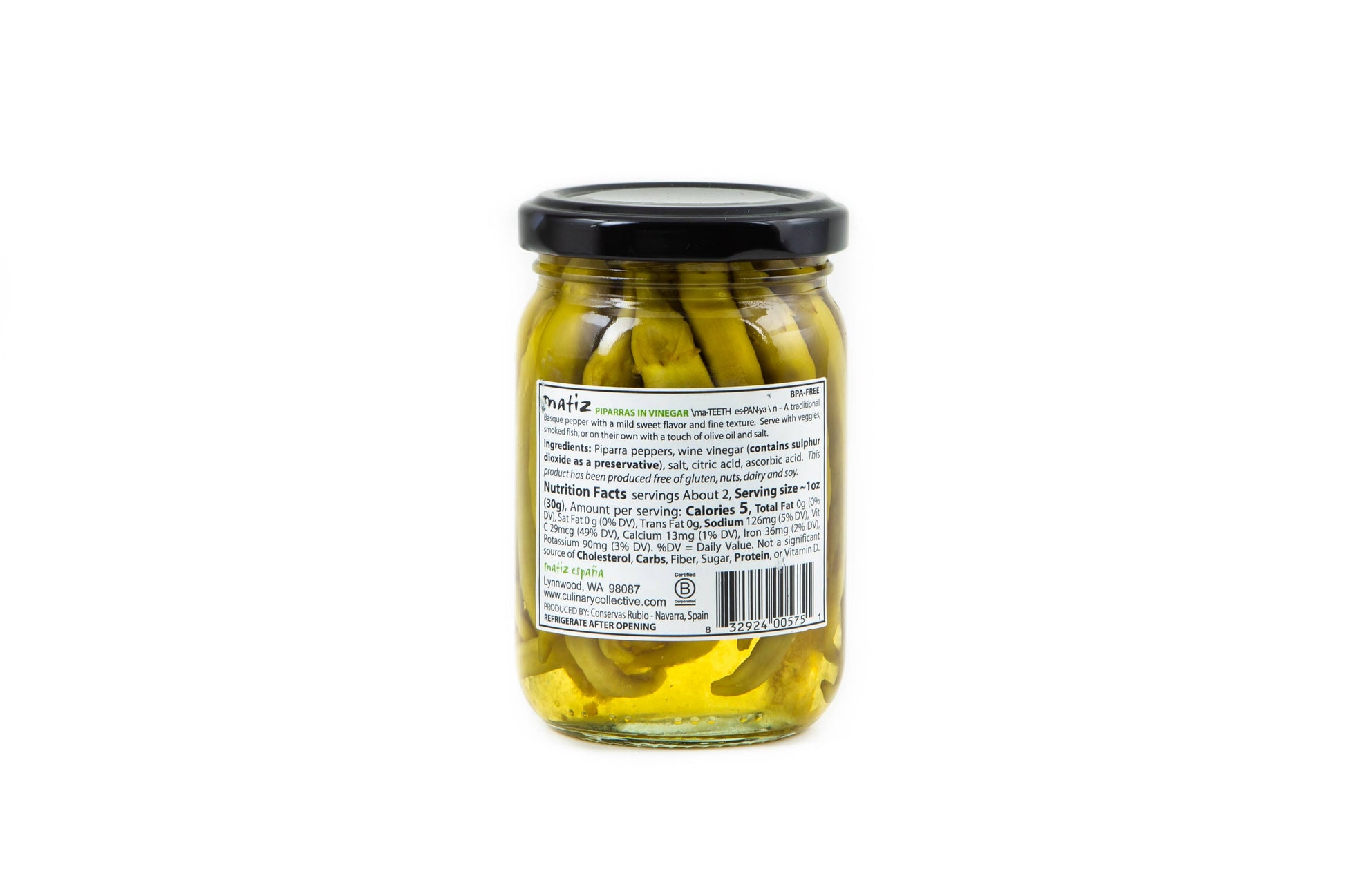 Matiz Piparra Peppers are a traditional long green pepper from the Basque country of Spain. With a mild slightly pickled flavor, they make a wonderful accompaniment to bonita tuna and smoked fish, or try them drizzled with olive oil and salt.